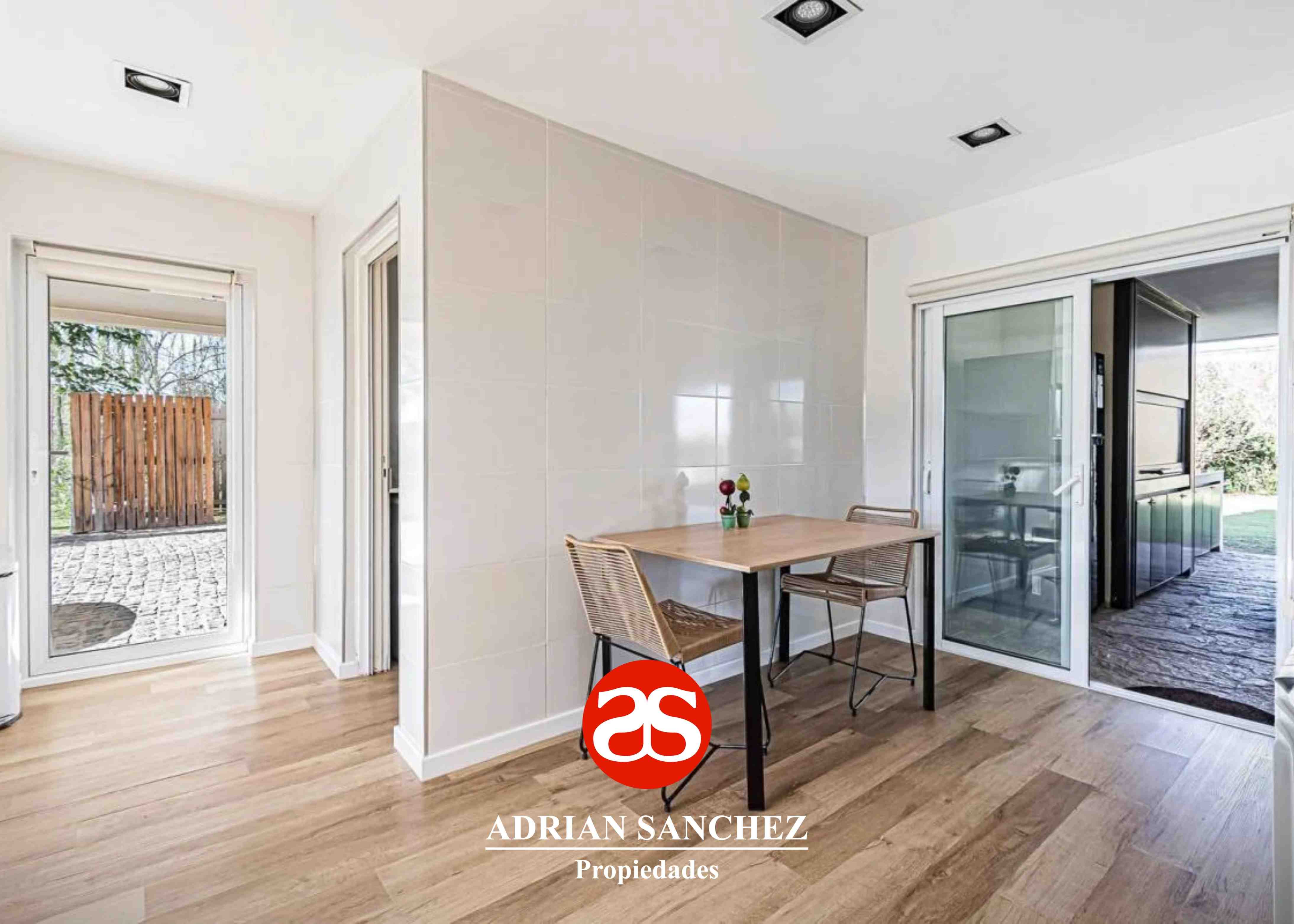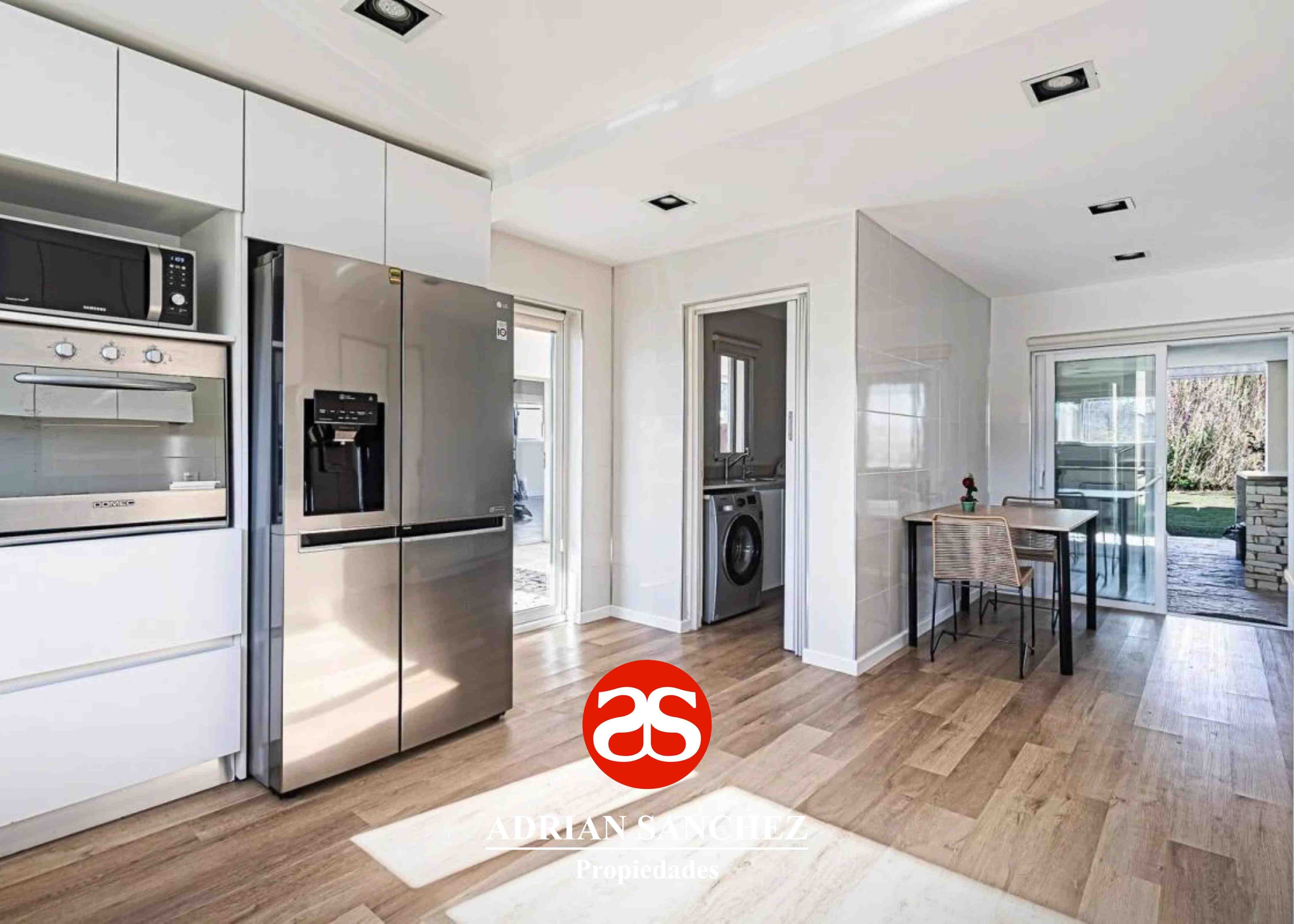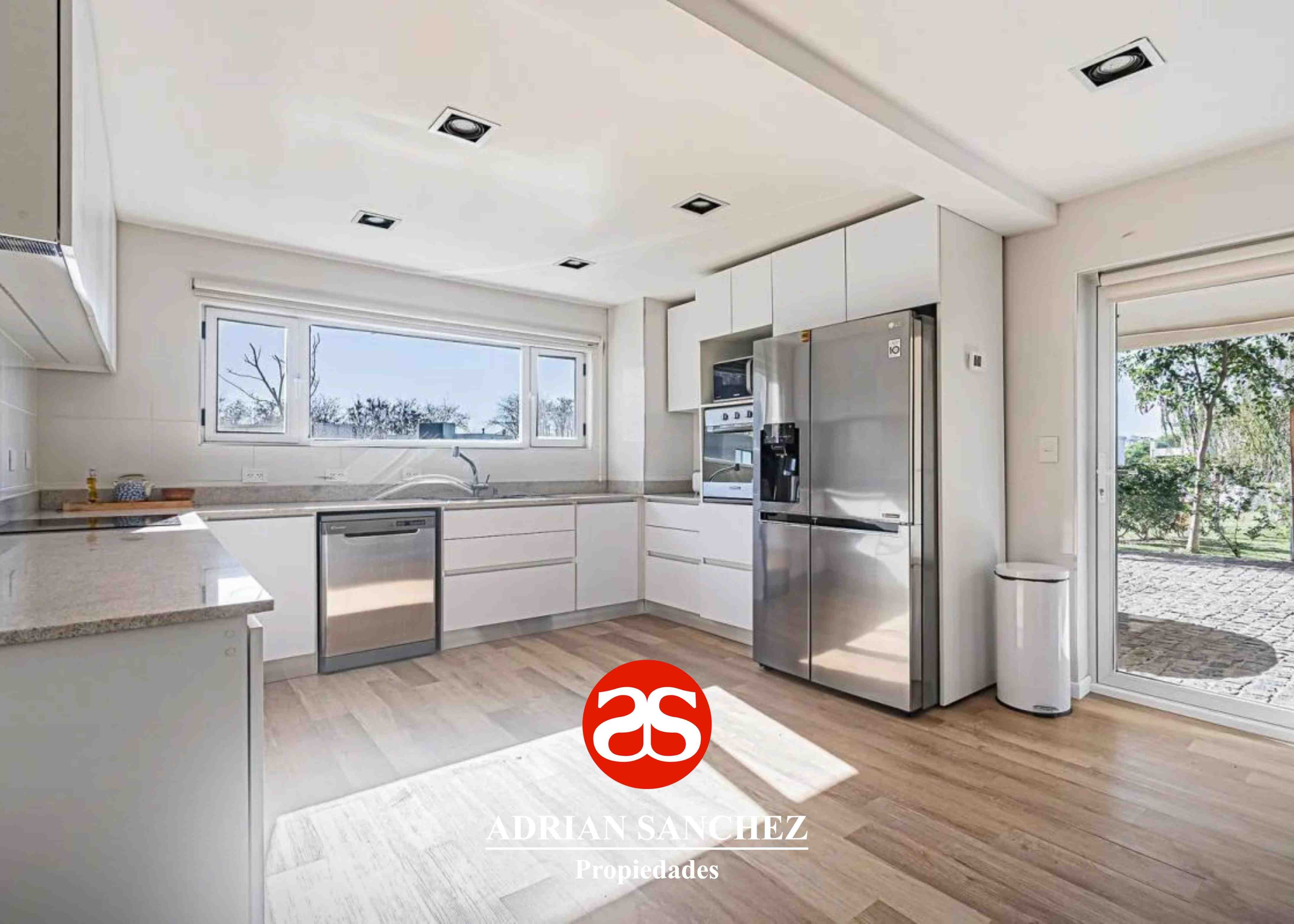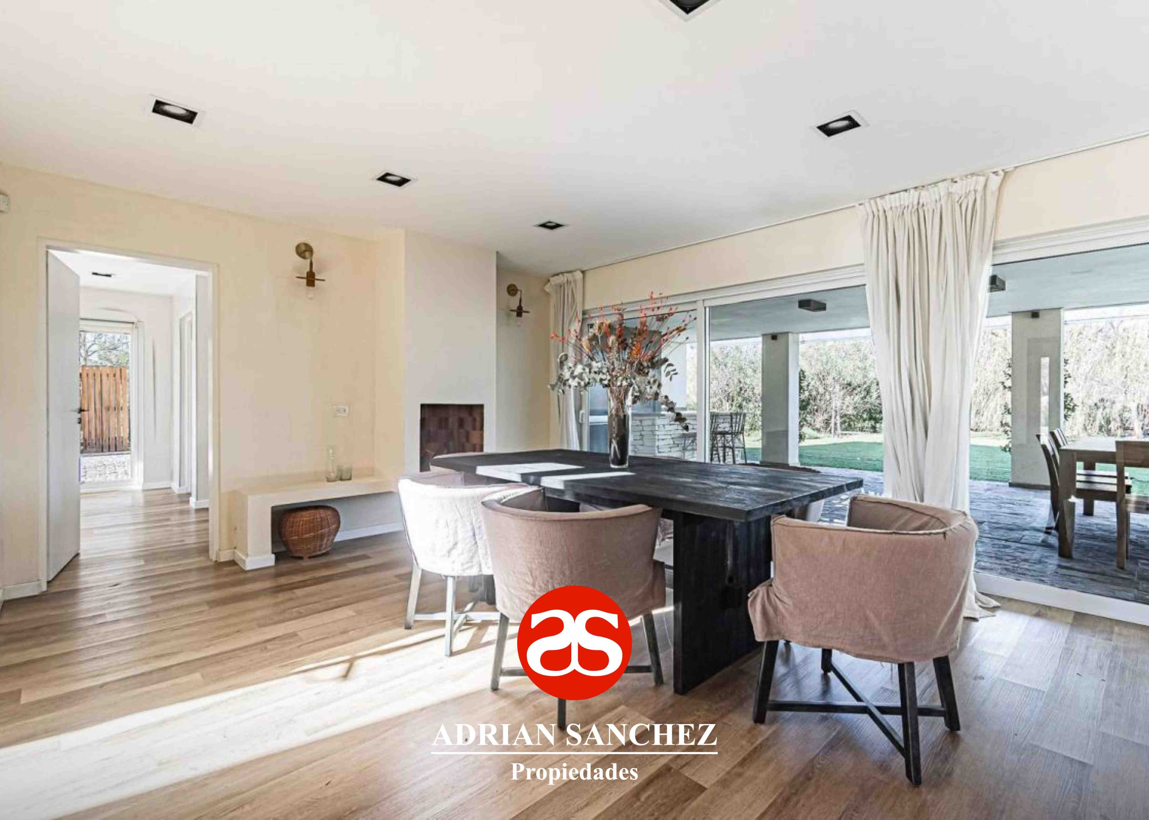 - Planta Baja: amplio living-comedor con hogar a leña, toilette de recepción, cocina completa con comedor diario, lavadero independiente, baño de servicio y dormitorio en suite. Garage cubierto para 2 vehículos.