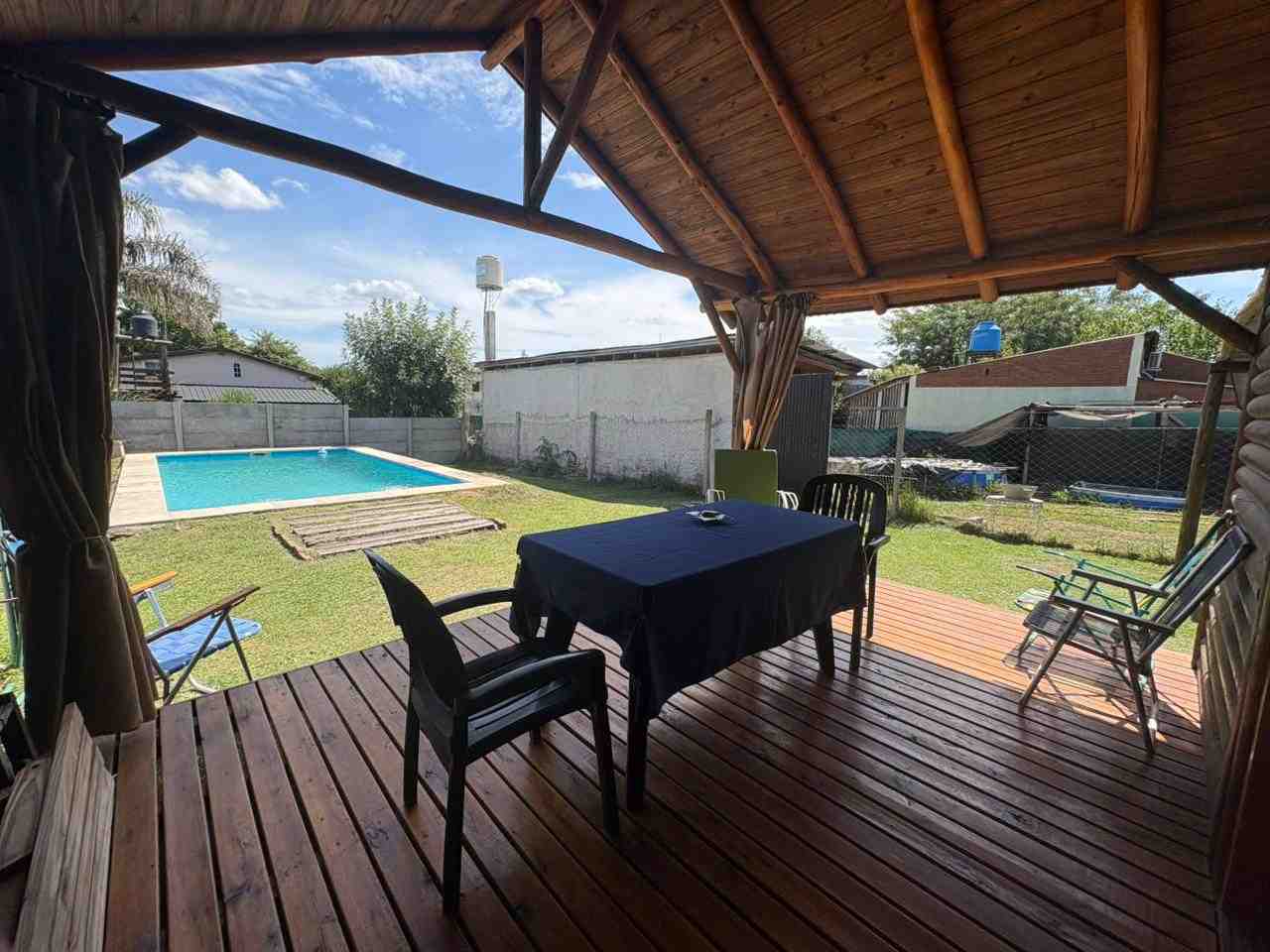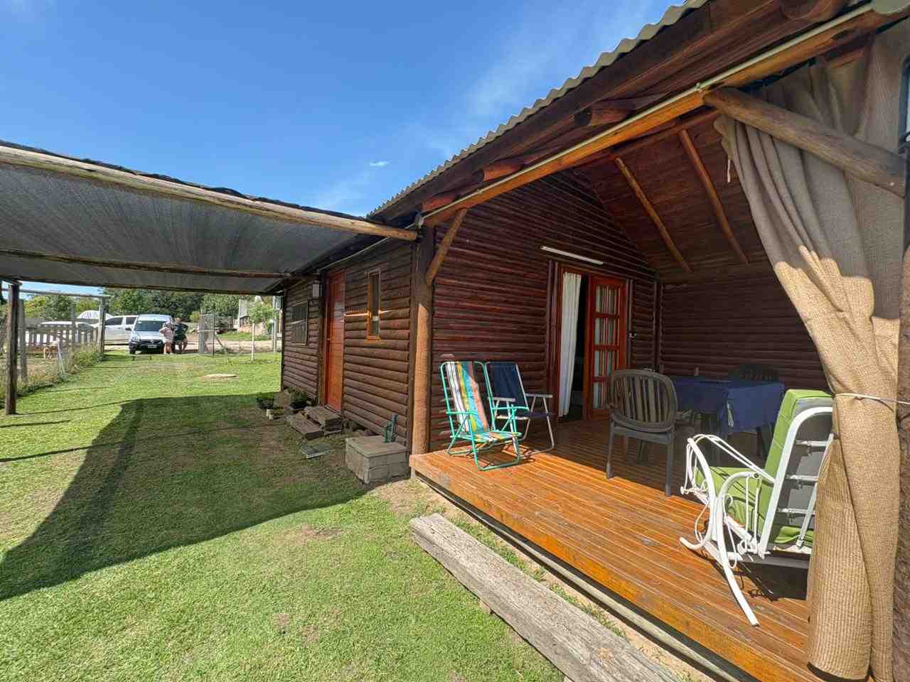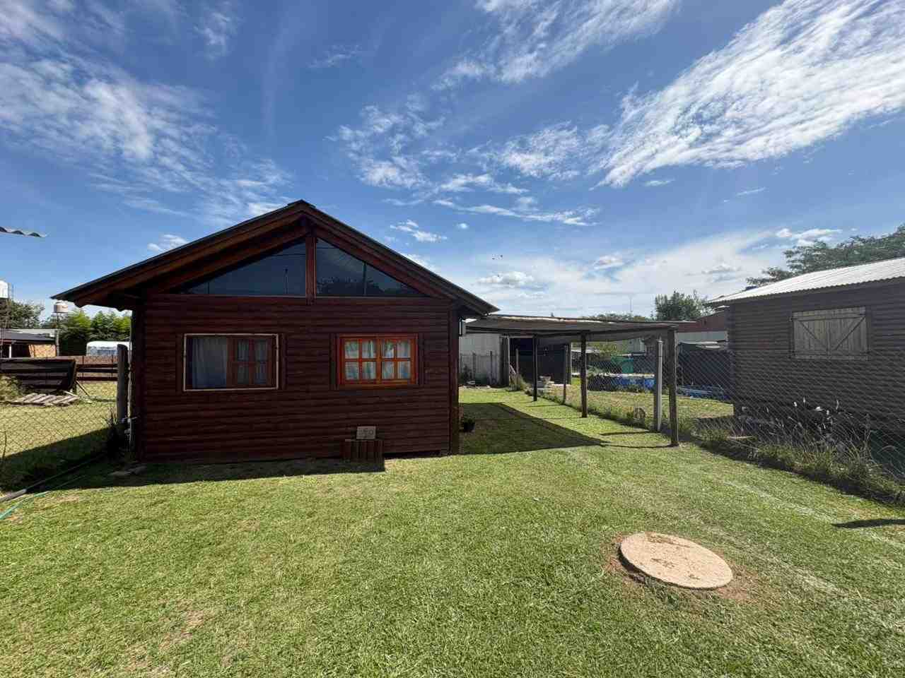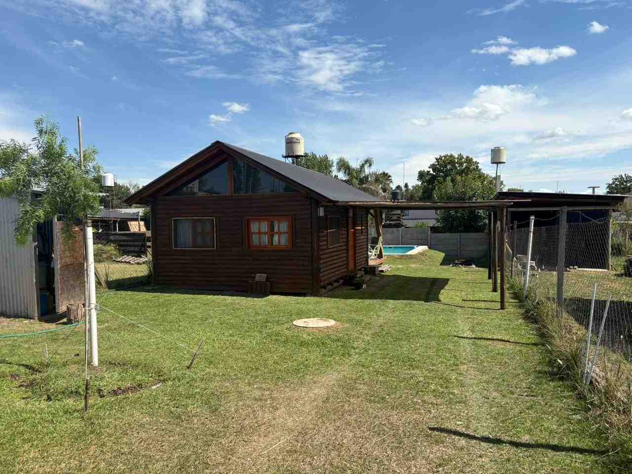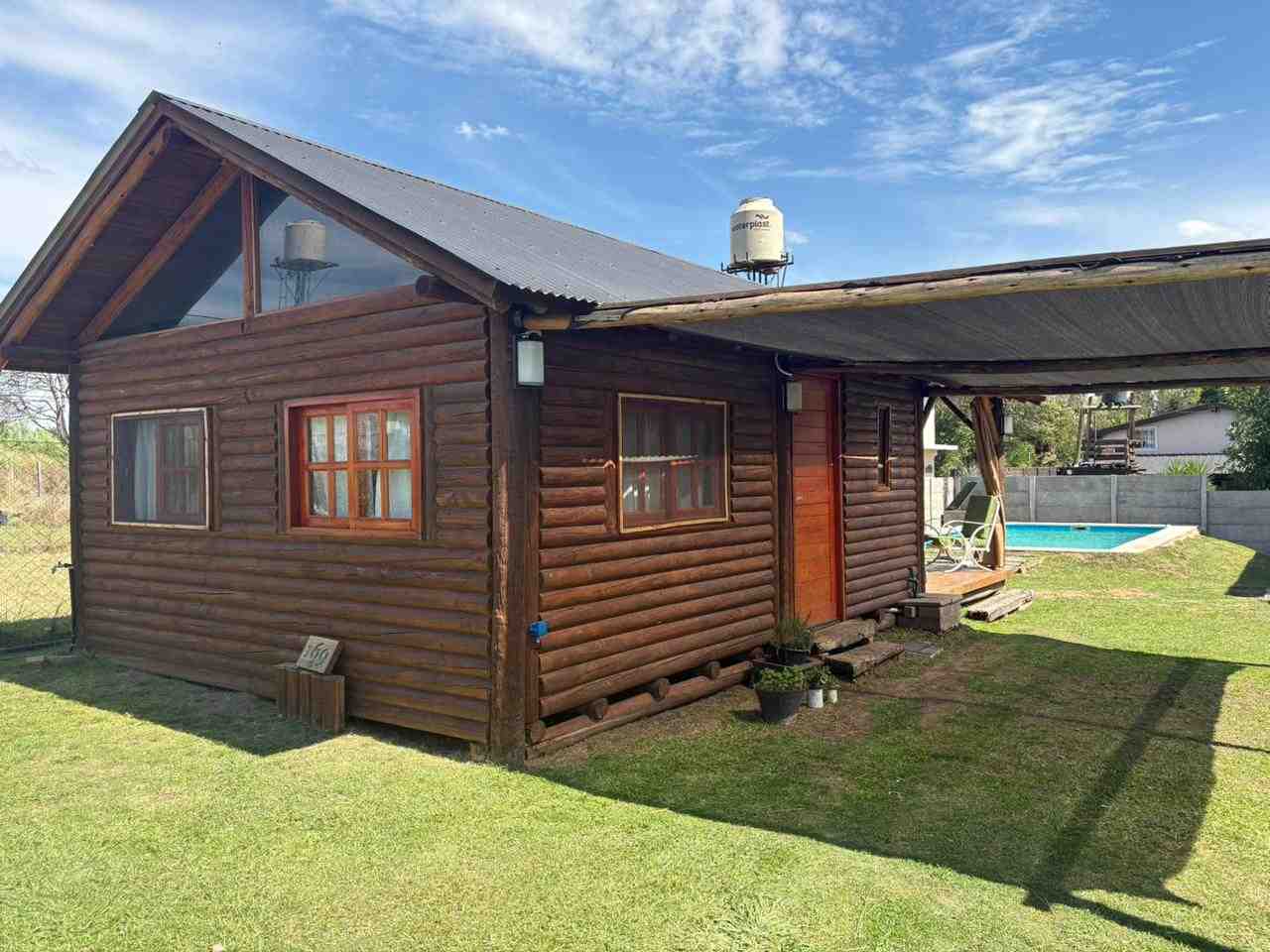 Cabaña monoambiente construida totalmente en madera que consta de cocina, baño con ducha y pequeña galería. Pérgola de troncos y media sombra para vehículo y piscina de 8 m. x 4 m. con bordes atérmicos y equipo de filtrado. Baño de servicio exterior.