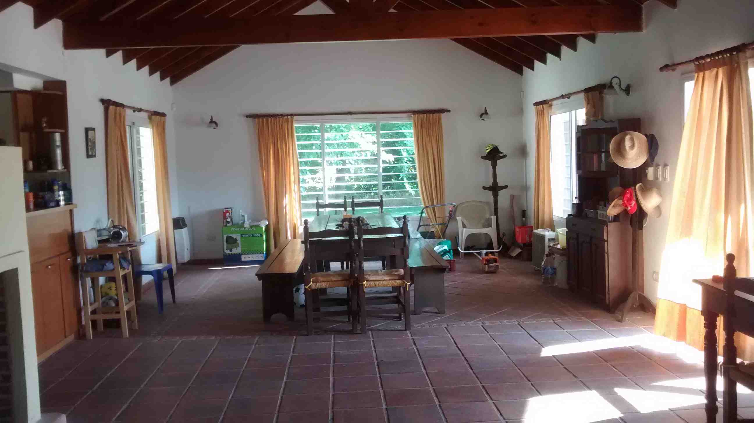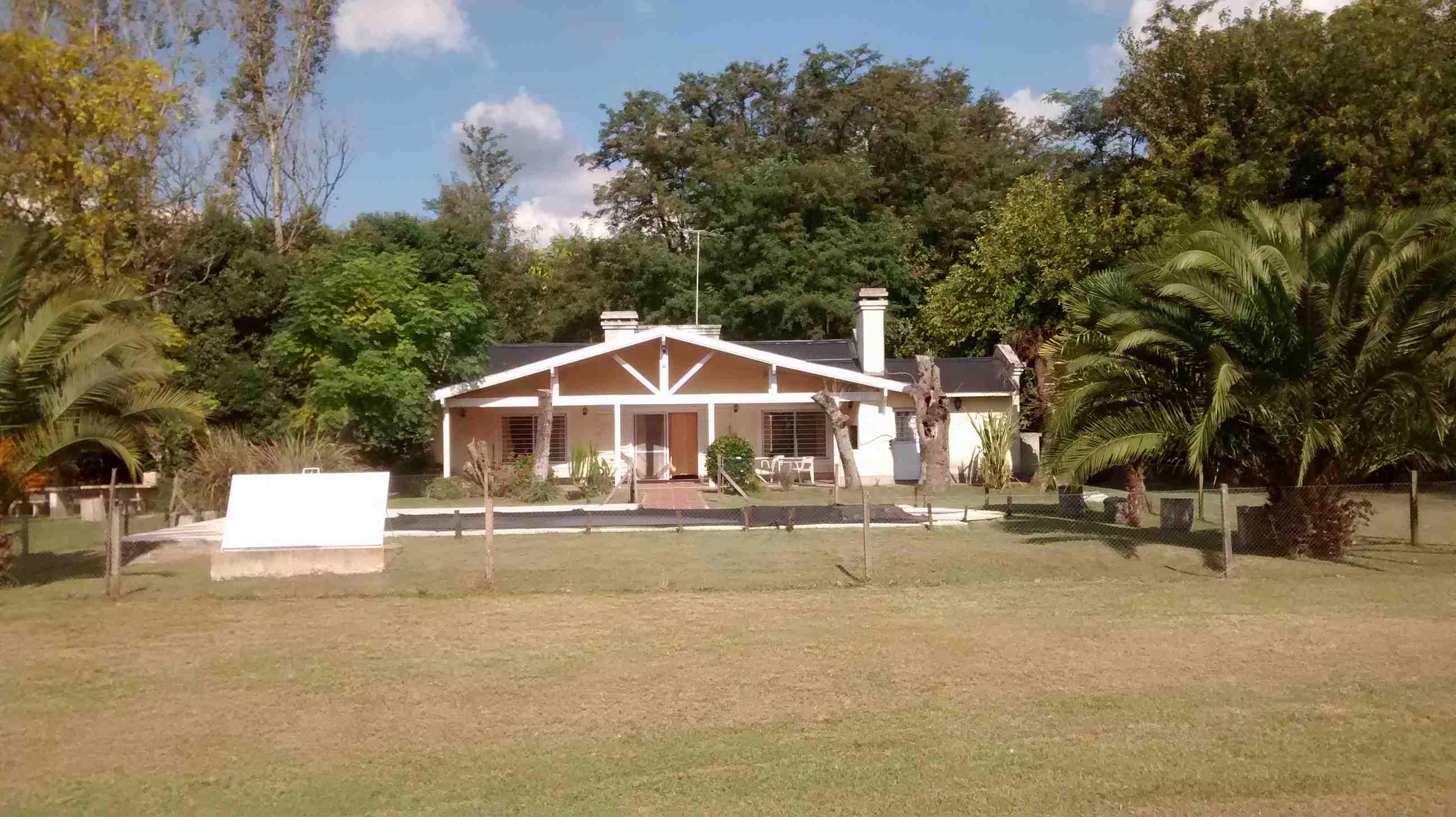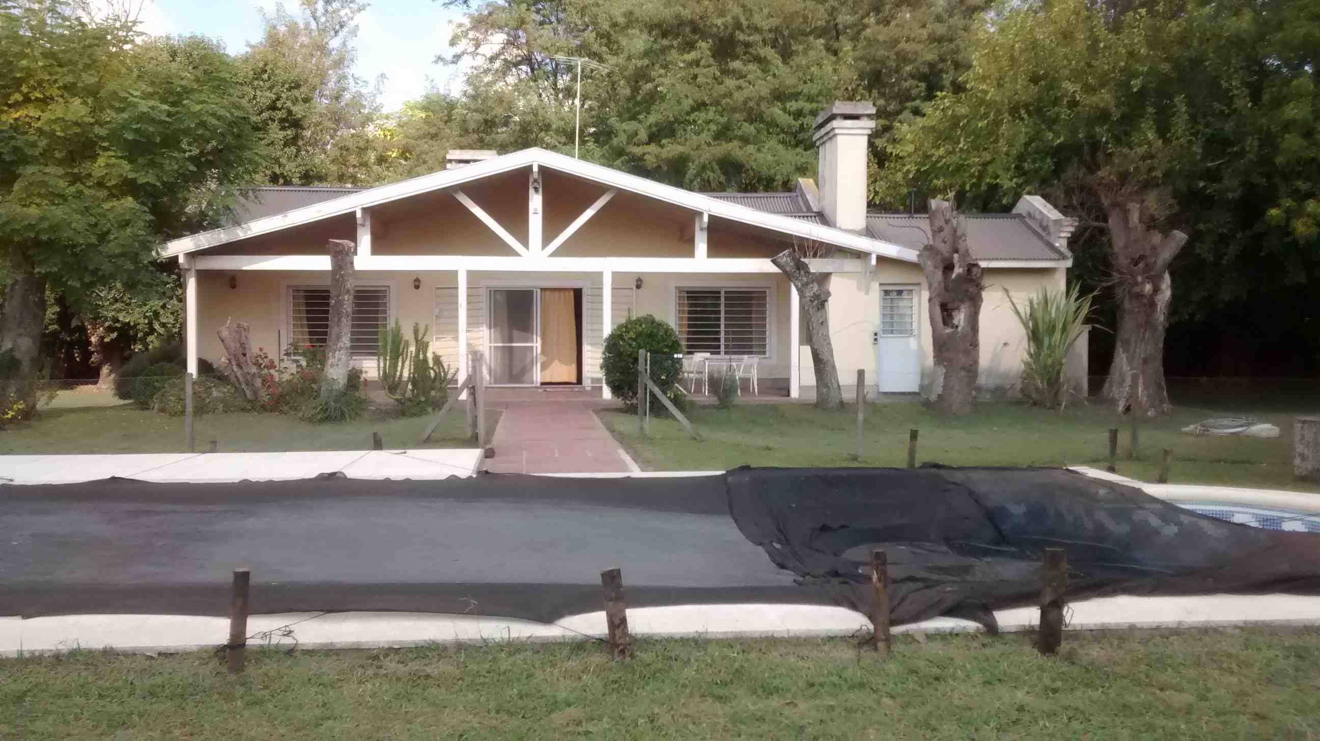 Casa Principal: Casa con cocina comedor diario amueblada y con barra; amplio living comedor integrados con hogar; toilette; baño completo compartimentado, pasillo distribuidor a baño y 4 dormitorios con placard con ventiladores de techo y calefactores. Galería con parrilla, lavadero y baño para piscina. Piscina de 8 m. por 4 m. con filtro, con guarda de venecitas, bordes y solarium atérmico y cercada. Antigüedad de 14 años. Posee planos. Techo de chapa de zinc negro con cielo raso de madera, pisos rústicos rojos, aberturas de aluminio blanco con rejas, muy luminosa y calefaccionada por calefactores de tiro balanceado. Iluminación con faroles en su exterior. Alarma. Tres perforaciones (molino con 2 tanques australianos y 2 bombas centrífugas), potreros, 2 bebederos y gallinero. Orientación: Noreste.