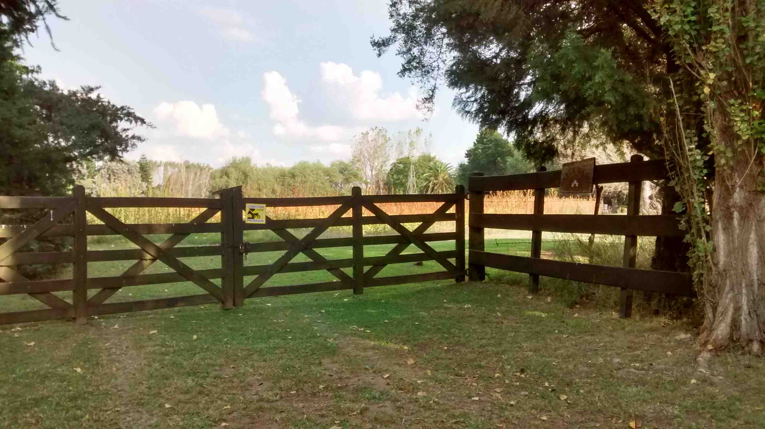 63.739,46 m2. (144,80 m. x 144,40 m. x 445,35 m. y 445,56 m.) alambrados, parquizados, arbolados en todo su perímetro, gran arboleda central, iluminado en las cercanías a la casa con parrilla y horno de barro.
