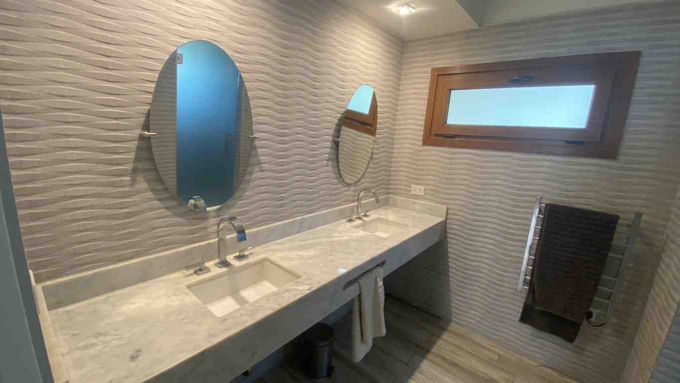Dentro de estos espacios vamos a poder ver detalles llevados a cavo por una decoradora de interiores como revestimientos Españoles, travertino pulido en las mesadas, en la barra de la cocina travertino sin pulir con paredes de símil óxido. También muebles artesanales de alto valor como un sillón de cuero de 3 cuerpos, una mesa ratona hecha en base a una zorra antigua, y el techo que sale de lo tradicional siendo de dos tonalidades. De estos detalles hay miles!